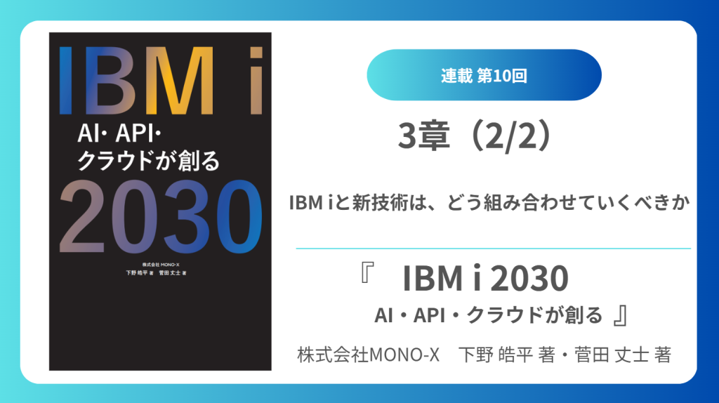 2024年7月、IBM i ユーザーと関係者の皆さまへ向けた書籍『IBM i 2030 AI・API・クラウドが創る』を出版いたしました。本書の内容をより多くの方にお伝えするため、当ブログでは各章の要点を連載形式でサマリーとしてご紹介いたします。本記事では全体像を簡単にご理解いただき、さらに詳しく知りたい方はぜひ書籍の詳細をご覧ください。